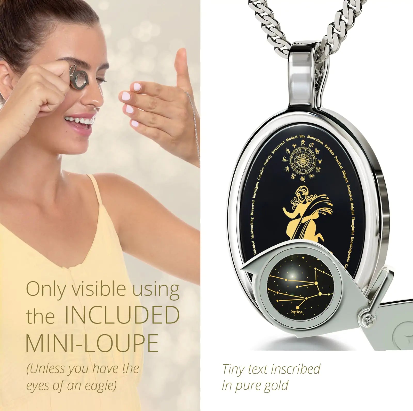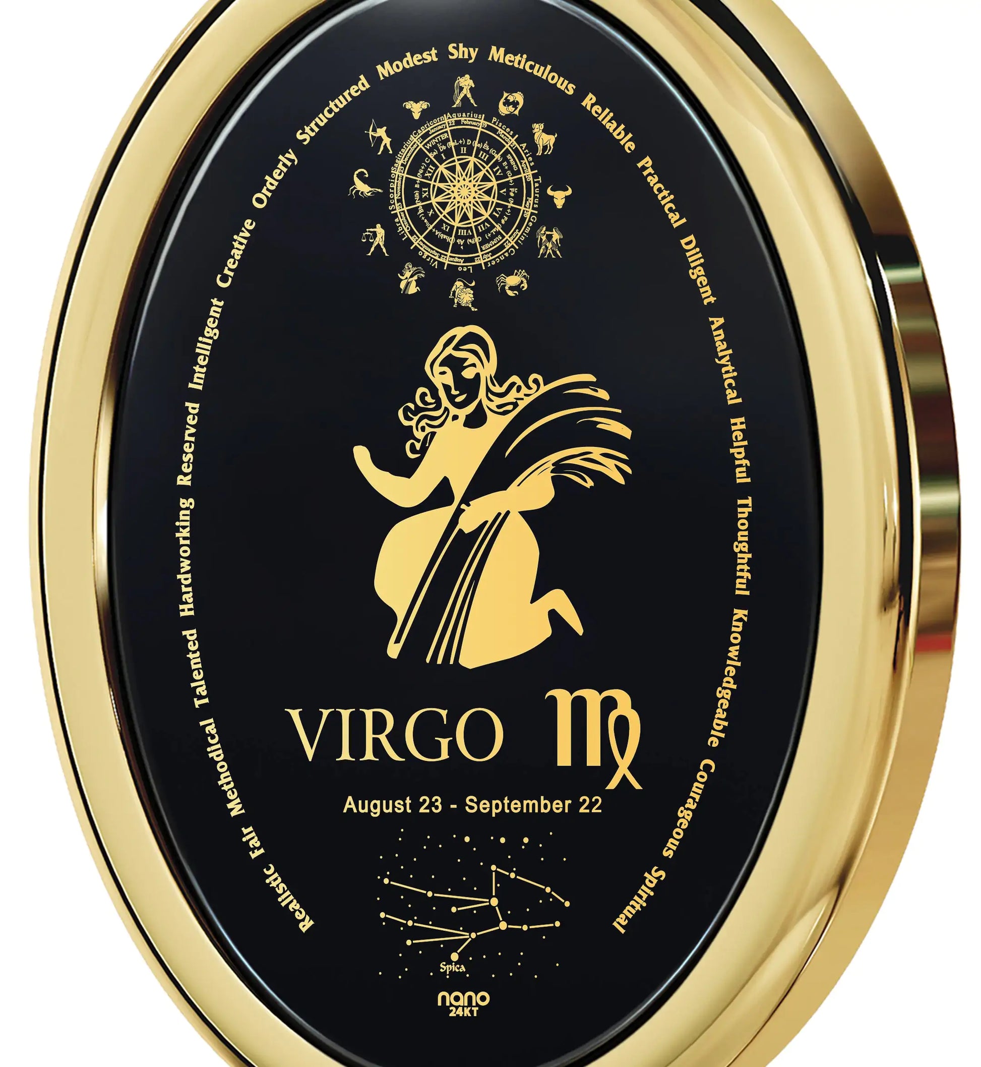 Celebrate the grace and intellect of Virgo with our exquisite Virgo Zodiac Pendant, an elegant onyx masterpiece inscribed with intricate detail of the maiden in 24k gold, delicately encased in your chosen oval metal frame. Virgo individuals, known for their talent, intelligence, and modesty, exude timeless elegance. Whether honoring your own birth month or presenting a meaningful gift, this zodiac necklace beautifully captures the essence of Virgo's unique qualities. A distinctive birthday idea, it holds special appeal for astrology enthusiasts who embrace their horoscopes, making it a thoughtful and awe-inspiring gesture for any woman – be it your wife, girlfriend, daughter, or best friend.