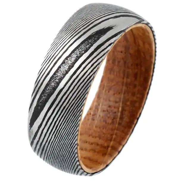 Wood Grain Damascus Steel and Whiskey Barrel Ring